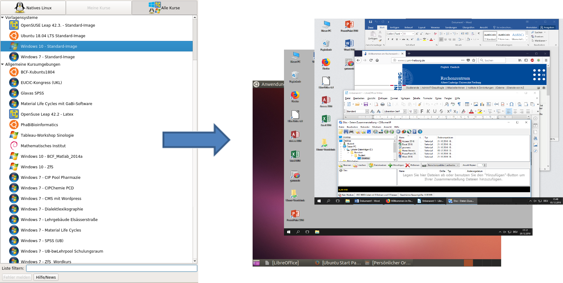 bwLehrpool bietet Dozierenden an Hochschulen und Universitäten in Baden-Württemberg die Möglichkeit, schnell, einfach und unabhängig von Dritten personalisierte Lehrumgebungen für Studierende bereitzustellen. Grundlage dazu sind die heutigen Möglichkeiten der Virtualisierung und die zumeist stark ausgebaute IT-Infrastruktur von Hochschul-Rechenzentren. Mit Hilfe eines speziell entwickelten Hilfstools, der bwLehrpool-Suite, können alle Hochschulmitarbeiter Virtuelle Maschinen hoch- bzw. herunterladen. Auf Basis von als Vorlage bereitgestellten VMs können Dozierende die Umgebung individuell auf die Bedürfnisse ihrer Lehrveranstaltung anpassen. Die angepassten VMs werden anschließend wieder hochgeladen und stehen sofort in allen oder nur in ausgewählten Poolräumen zur Verfügung. Zusätzlich können VMs landesweit mit anderen Institutionen geteilt werden, um maximale Synergieeffekte zu erzielen.