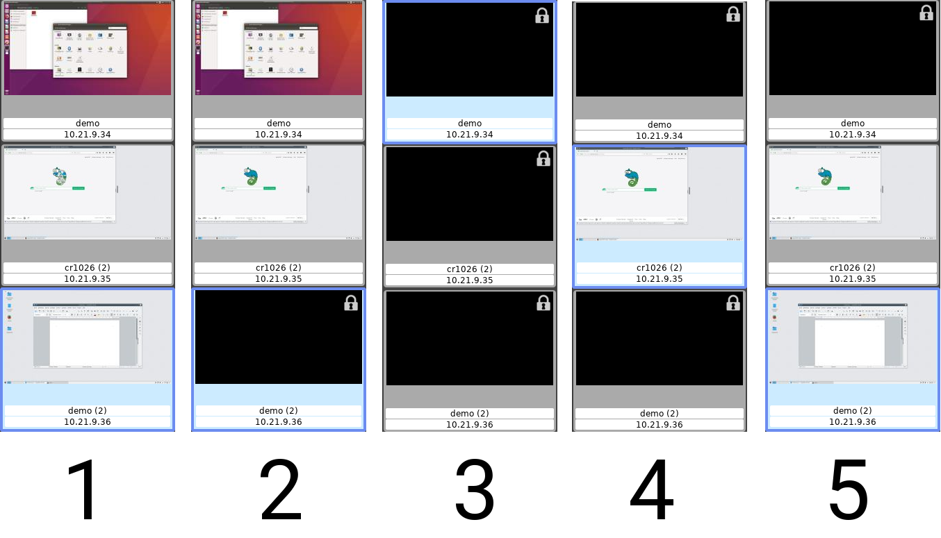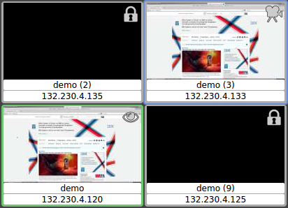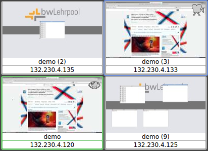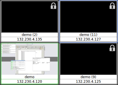 Der Dozierende sieht auf der Steuerkonsole ein verkleinertes Vorschaubild und den Nutzernamen eines jeden verbundenen Clients. Nicht verbundene Clients werden als statisches Symbol dargestellt (siehe nächster Abschnitt Die PVS-Management-Konsole).