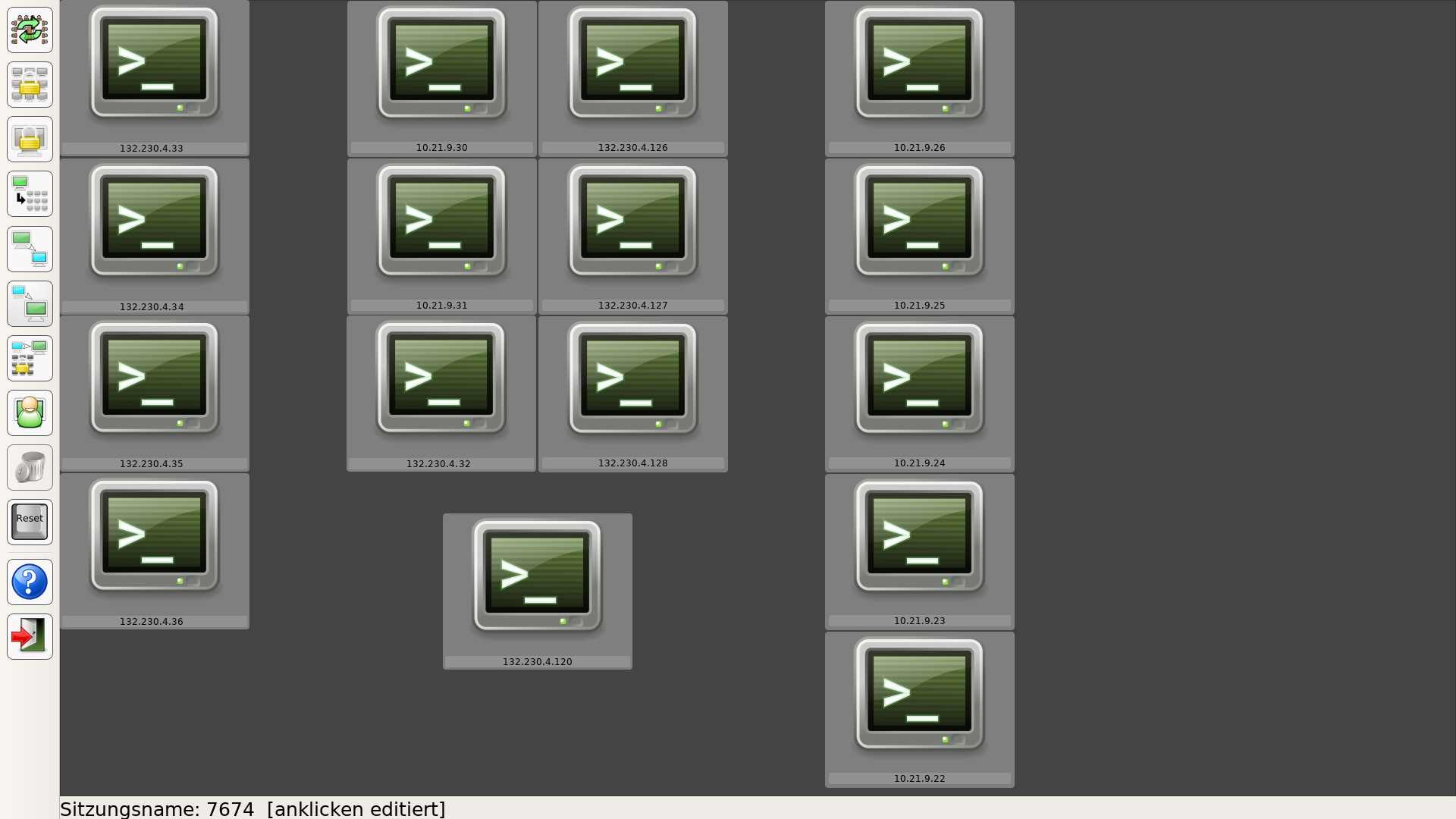 | Der Status der Arbeitsplätze wird mittels des schematischen Raumplans angezeigt. Unbelegte Rechner sowie Rechner, an denen keine PVS-Anmeldung erfolgte, werden durch Anzeige eines Standardsymbols mit darunter befindlicher, ausgegrauter IP-Adresse dargestellt. Nach erfolgter Anmeldung am PVS-System wird über dem Adressbalken die Login-Userkennung angezeigt, beides hervorgehoben und anstelle des Rechnersymbols eine Miniaturdarstellung des entfernten Bildschirms eingefügt. Ein Account kann sich an mehreren Arbeitsplätzen gleichzeitig anmelden. In diesem Fall werden zusätzliche Anmeldungen durch eine in Klammern befindliche Zahl hinter dem Namen gekennzeichnet. |