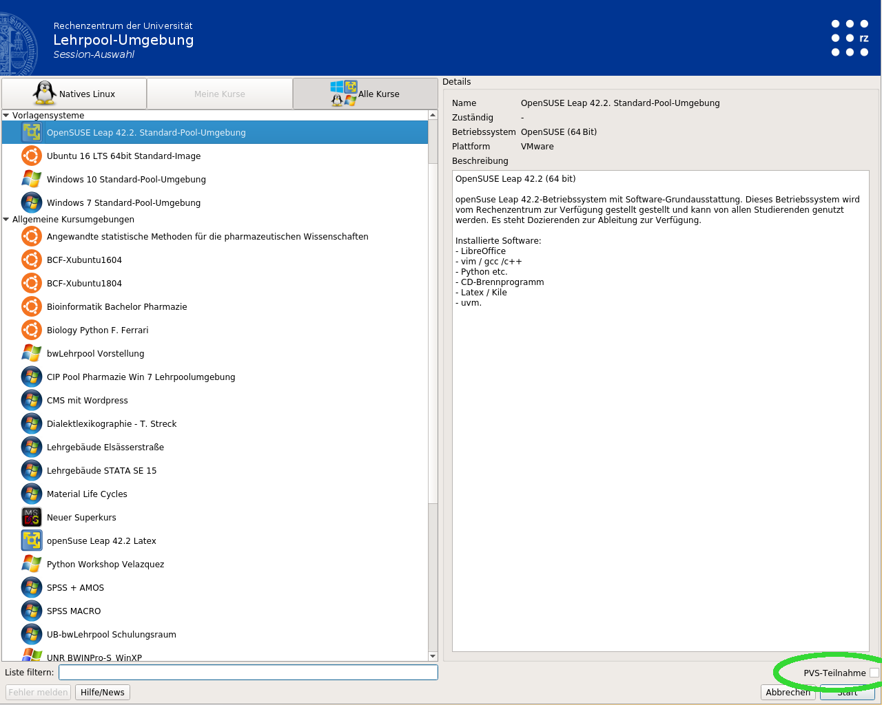 Um die Steuerkonsole zu starten, melden Sie sich an einem bwLehrpool-Client, wechseln auf den Reiter „Natives Linux“ und wählen „PVS Steuerkonsole“. Ausgewählte Clientrechner können auch explizit als PVS-Manager eingerichtet werden, damit sie direkt und ohne vorherige Anmeldung die Steuerkonsole starten. Bitten Sie gegebenenfalls Ihr Rechenzentrum, die Einrichtung für Sie zu übernehmen, und verweisen die Wikiseite zum Satellitenserver-Raumplaner.
