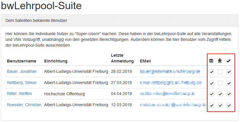 Nutzer, die sich mindestens einmal per bwLehrpool-Suite auf dem Satellitenserver eingeloggt haben, also dem Satellitenserver bekannt sind, werden in der Benutzerliste aufgeführt. Es kann pro einzelner Person eingestellt werden, ob diese Emails erhält (Häkchen unterhalb Briefumschlagssysmbol), und ob sie Super-User-Status (SuperAdmin) erhalten, also auf alle Veranstaltungen und VMs Vollzugriff erhalten (Häkchen unterhalb Schach-Königssymbol). Eine Person kann ebenfalls von der Nutzung des Satellitenservers ausgeschlossen werden, indem das Häkchen unter dem Häkchensymbol entfernt wird.