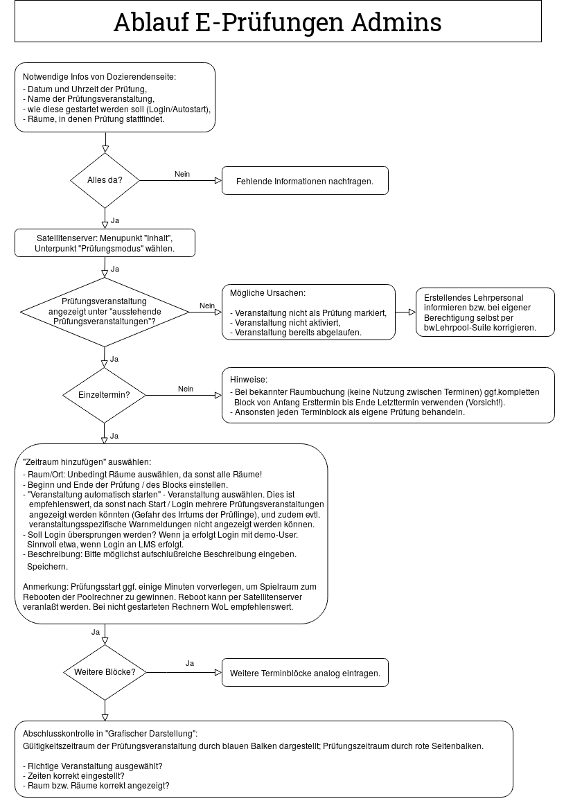 Nebenstehende Abbildung zeigt den schematischen Ablauf einer E-Prüfung. Eine druckbare pdf-Version des kann hier heruntergeladen werden.