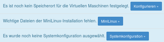 • Einrichtung unvollständig: Ein notwendiger Konfigurationsschritt wurde nicht ausgeführt. Klicken Sie darauf, rufen Sie die Startseite auf oder gehen Sie direkt – wenn bekannt – zum fehlenden Konfigurationsschritt. Vergleiche auch untenstehendes Kapitel Erstkonfiguration.