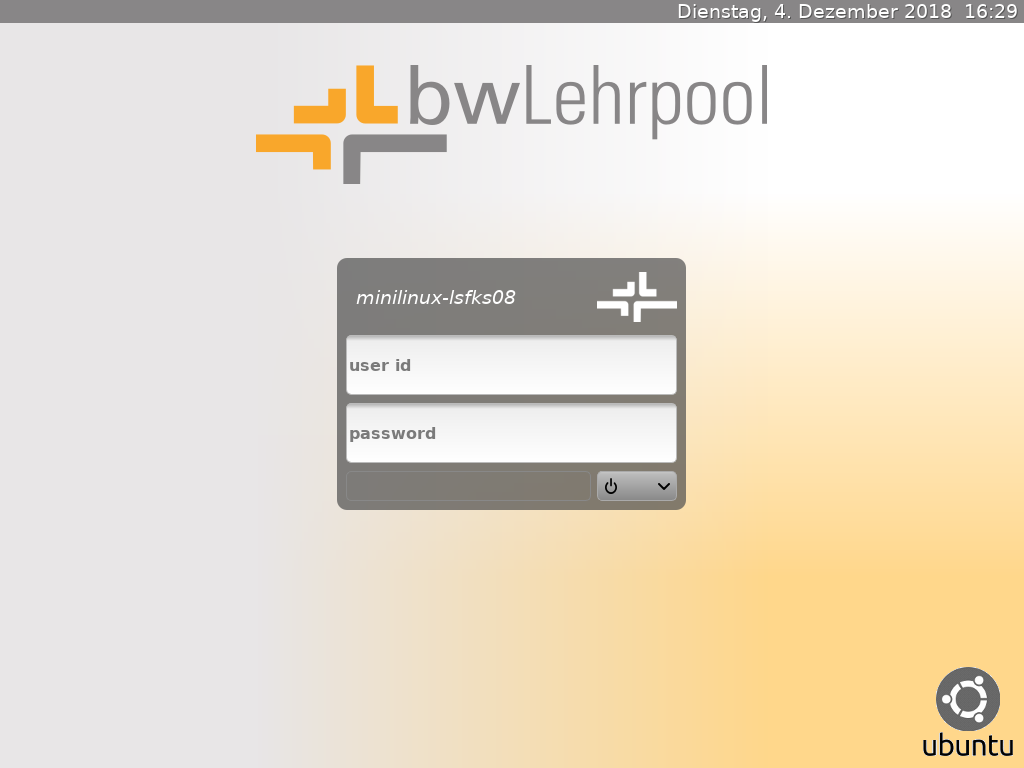 Starten Sie einen Client und booten bwLehrpool. Wird keine ID44-Partition erkannt, wird eine Warnmeldung auf der Loginmaske angezeigt. Ohne diese Meldung können Sie davon ausgehen, dass die Partition erkannt und verwendet wird. Vergleichen Sie dazu bitte die unten dargestellten Grafiken.